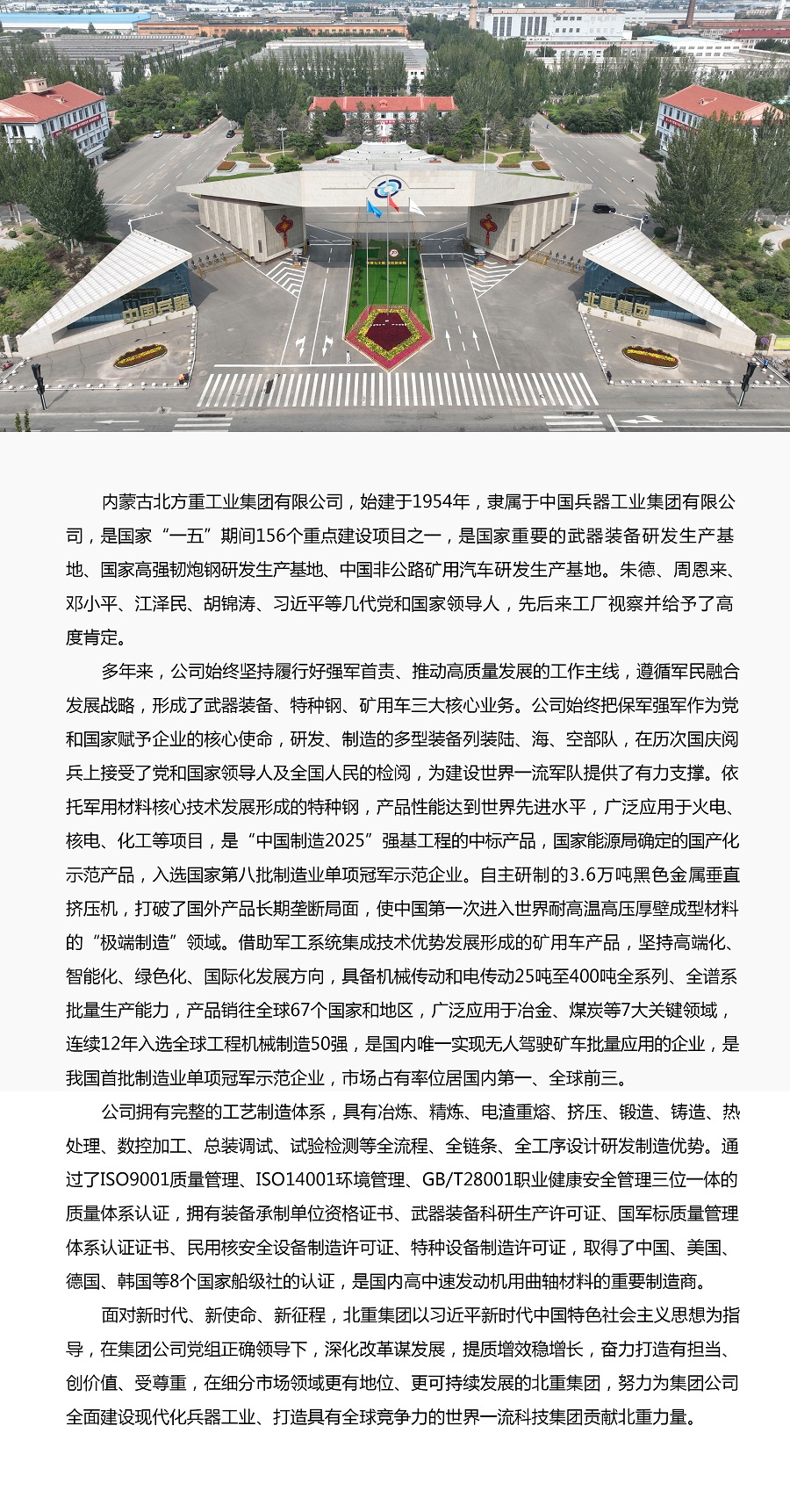 內(nèi)蒙古北方重工業(yè)集團(tuán)有限公司,始建于1954年,隸屬于中國兵器工業(yè)集團(tuán)有限公司,是國家“一五”期間156個重點建設(shè)項目之一,是國家重要的武器裝備研發(fā)生產(chǎn)基地、國家高強(qiáng)韌炮鋼研發(fā)生產(chǎn)基地、中國非公路礦用...[詳情]